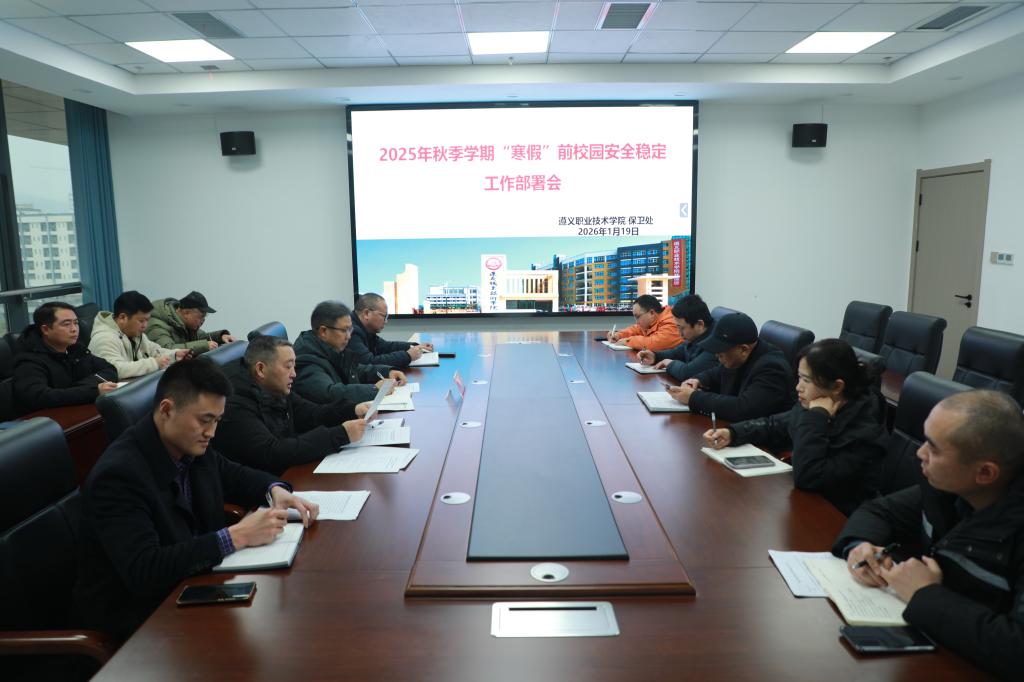 为深入学习贯彻习近平总书记关于安全生产的重要论述精神,全面落实省教育厅关于2026年元旦春节期间学校安全稳定工作的部署要求,切实做好岁末年初校园安全管理,1月19日下午,遵义职业技术学院在新图书馆621会议室召开校园安全稳定工作专题会议。会议由保卫处处长赖刚主持,党委委员、副院长陈良万出席会议并讲话。保卫处全体人员,红城物业公司、消防维保公司、一二食堂、丰田4S店、三期工程施工单位及校内企业相关负责人参加会议。