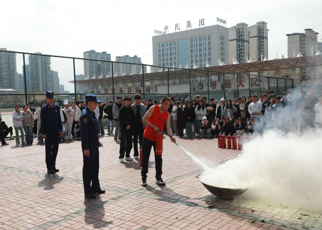 知识培训结束后,活动进入最关键的应急演练环节。为最大限度贴近火灾真实场景,师生在“一站式学生社区”开展了疏散逃生演练。随着尖锐的警报声骤然响起,全体师生员工严格按照预定疏散方案,迅速拿起湿毛巾捂住口鼻,弯腰低姿前行,沿着预设的疏散路线,快速、有序地进行疏散。 疏散逃生结束后,全体人员移步至体育馆,开展灭火实操演练。新蒲新区消防救援大队消防员陈立涛首先向师生们详细介绍了干粉灭火器、二氧化碳灭火器等使用方法、适用场景及性能特点,特别强调“一提、二拔、三握、四压”的核心操作步骤,并结合动作要领现场演示。随后,师生们以2人一组为单位,依次上前进行模拟火源扑灭实操。在消防员的现场指导与纠正下,大家严格按照操作规范,熟练完成提灭火器、拔保险销、握喷管、压把手等一系列动作,成功扑灭初期火源。通过实操演练,师生们切实掌握了灭火器的使用技巧,有效提升了应对初期火灾的处置能力和实操信心,真正实现了“从理论到实践、从认知到应用”的培训目标。
