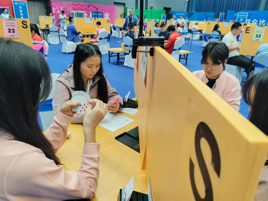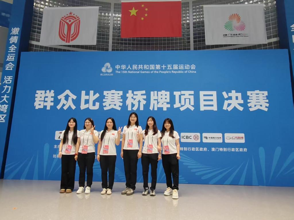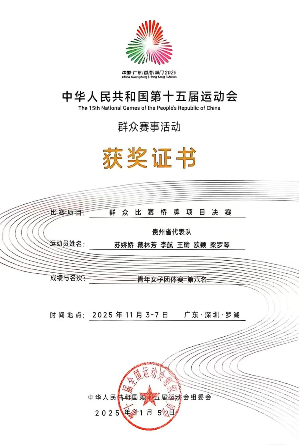 11月3日至7日,中华人民共和国第十五届全国运动会群众赛事活动桥牌项目决赛在广东省深圳市罗湖区举行。贵州省青年女子桥牌代表队六名队员中,我院22级学前专业梁罗琴、22级牧医专业欧颖两位同学发挥出色,与其他队员密切配合,历经三天激烈角逐,最终斩获青年女子团体第八名的优异成绩。此次参赛,实现了遵义职业技术学院建院以来学生参加全运会赛事“零的突破”。