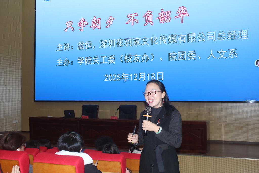 12月18日下午,由学院关工委牵头,院团委(学工部)、人文旅游系党总支组织的优秀校友进校园专题报告“只争朝夕,不负韶华”,在学院知行楼人文旅游系多功能教室举行,报告人是学院优秀校友翁恒。