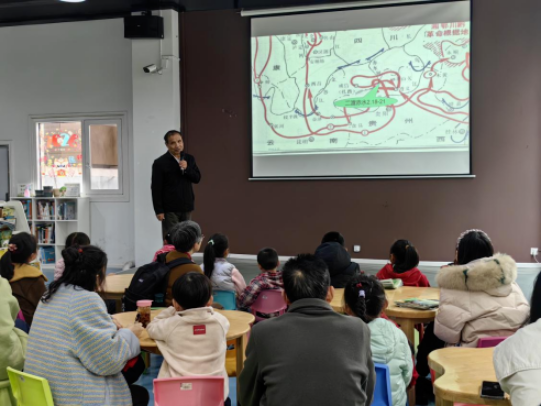 活动特邀遵义市关工委宣讲团成员、遵义职院副教授申卡辉老师主讲。申老师以真挚生动的语言,深情讲述了毛主席与红军长征四渡赤水的光辉历史,带领亲子家庭重温峥嵘岁月。讲到动情处,申老师现场唱响《四渡赤水出奇兵》,激昂旋律点燃全场,氛围热烈感人,让孩子们在歌声与故事中感悟长征精神。