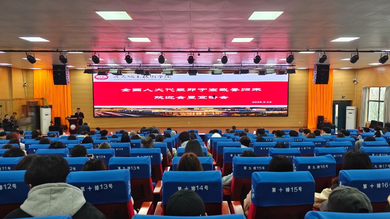 十四届全国人大三次会议于3月11日在京胜利闭幕,全国人大代表、我院现代农业系教授邱宁宏在圆满完成各项使命后载誉归来。为第一时间在全校师生中掀起学习全国两会精神的高潮,弘扬工匠精神,讲好职教故事,3月13日上午,学院在娄山大讲堂举行邱宁宏教授载誉归来欢迎会暨宣讲会,活动由党委副书记、院长覃晓龙主持。学院在家院领导,各院(系)、各部门负责人,各级劳模,“两代表一委员”,思政教师、辅导员(班主任),教师、学生代表等 300 余人参加。
