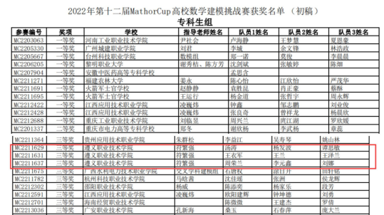 由基础部教师符繁强指导的我院学生汤涛、杨发波、谭思敏;王衣军、王兰、王泽兰;周荣兰、李元鑫、刘娜三组同学,在2022年第十二届MathorCup高校数学建模挑战赛荣获全国三等奖三项,本次竞赛共有8970支队伍参赛,包括7355支本科生队伍、1394支研究生队伍、221支专科生队伍,参赛队伍来自722所高校。 MathorCup高校数学建模挑战赛是由中国优选法统筹法与经济数学研究会主办的面向全日制普通高等院校在校学生的学科竞赛活动。竞赛的目的是通过竞赛活动,拓宽社会挖掘与培养优秀人才的渠道,搭建展示高校学生基础学术训练的平台。