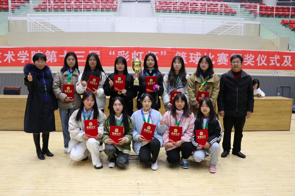 第十三届“彩虹杯”篮球赛精彩纷呈,在基础部和各院、系的精心准备下,经过40多天,30场比赛的激烈角逐,经济管理系、建筑与艺术设计系、机电与信息工程系分别获得男子组冠、亚、季军;机电与信息工程系、建筑与艺术设计系、人文旅游系分别获得女子组冠、亚、季军。张福琴、王永龙、晏泽民等12名同学荣获“优秀运动员”称号,并为本次比赛优胜队伍和“优秀运动员”颁发奖牌和证书。
