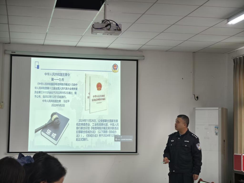 陈桂松同志结合《中华人民共和国反电信网络 诈骗法》及2024年12月1日施行的《电信网络诈骗及其关联违法犯罪联合惩戒办法》,通过PPT展示、案例剖析等形式,详细讲解了法律条文、诈骗常见手段及防范措施。