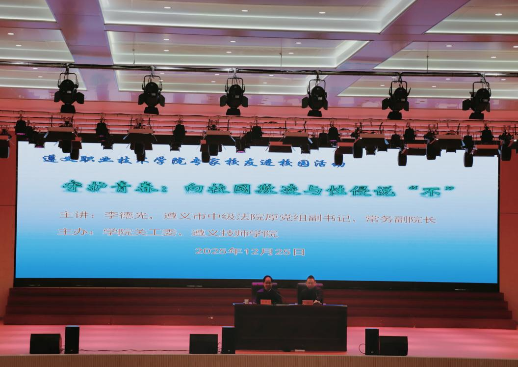 为切实加强校园安全管理,提升学生自我保护意识,防范校园欺凌与性侵事件发生,2025年12月25日,遵义职业技术学院关工委联合遵义技师学院共同举办“守护青春:向校园欺凌与性侵说‘不’”专家校友进校园宣讲活动。活动特邀遵义市中级法院原党组副书记、常务副院长李德光主讲,为师生们带来了一场兼具专业性与实用性的安全防护教育课。