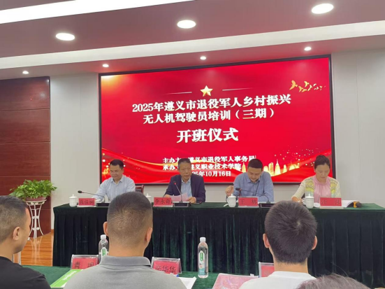 10月16日,由遵义市退役军人事务局主办、遵义职业技术学院承办的 2025 年遵义市退役军人乡村振兴无人机驾驶员培训(第三期)开班仪式,在遵义市退役军人就业创业教育基地(湄潭县北纬27度基地)隆重举行。遵义市退役军人事务局移交安置和就业创业科科长王林、副科长熊佳驹,遵义职业技术学院继续教育学院院长李永奇、副院长汪莎出席仪式,汪莎主持仪式,全体参训退役军人学员参加。