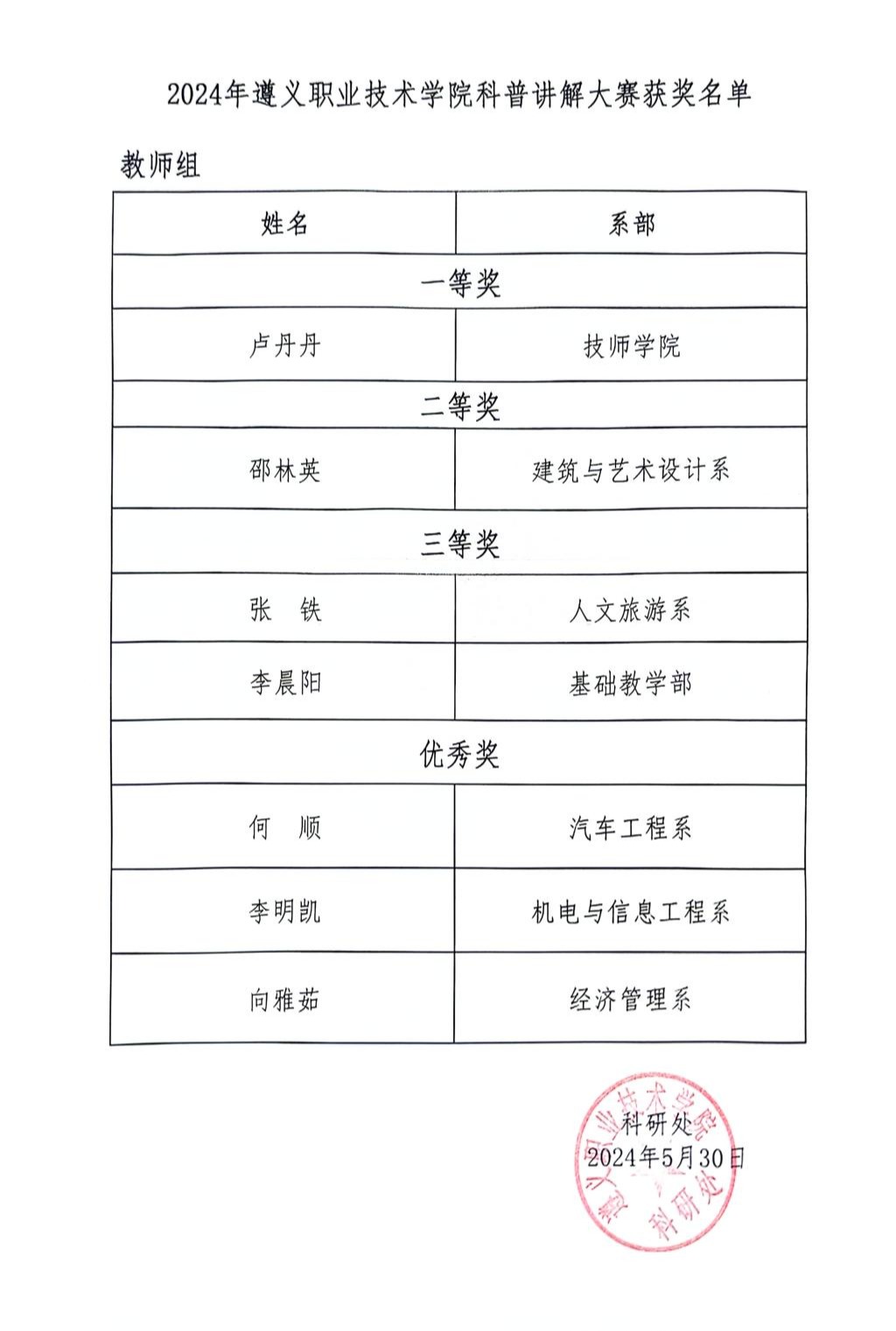 为落实习近平总书记关于科技创新的重要论述,加强国家科普能力建设,深入实施全民科学素质行动,大力弘扬科学家精神,根据《2024年遵义市科技活动周方案》要求,我院于2024年5月29日下午14:00在娄山大讲堂举办2024年科普讲解大赛决赛,300余名教师与同学观看比赛。与此同时,还邀请了遵义市科协、遵义市工业和科技局、遵义医科大学、遵义师范学院、贵州航天职业技术学院等部门和高校科普领域的专家担任评审。党委委员、副院长葛宁一及相关部门负责人观看了比赛。
