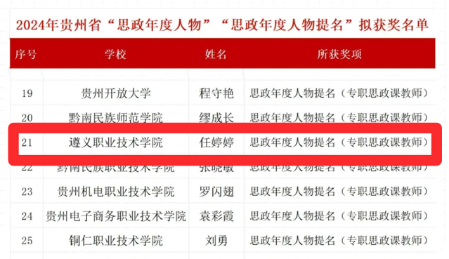 8月9日,贵州省教育厅正式公布了“思政年度人物”、“思政年度人物提名”以及“思政新秀”的评选获奖名单。在此次评选中,学院四位教师凭借出色的思政教学工作和卓越的表现脱颖而出,张绍禹、汪莎、徐曼曼三位老师获“思政新秀”,任婷婷老师获“思政年度人物提名”荣誉,目前正在公示中。