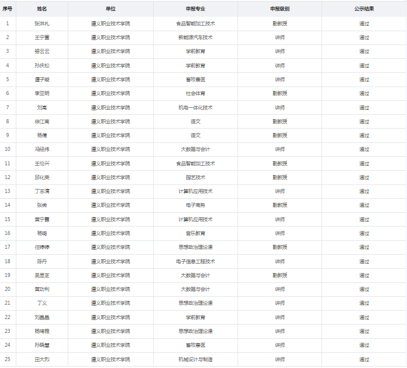 2025年度遵义职业技术学院高等学校教师系列专业技术职务任职资格高级评审委员会评审结果公示