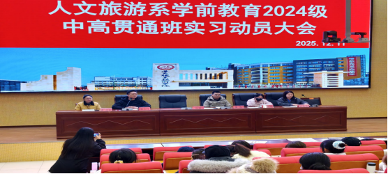 根据人才培养方案要求,人文旅游系于2025年12月11日在知行楼111召开学前教育专业实习动员会议。团总支书记、各科室负责人、学前教育教研室主任、附属幼儿园院长,学前教育24级中高贯通班辅导员、指导老师及学前教育24级中高贯通班全体学生参加了会议。会议由学前教育教研室主任刘晶晶主持。