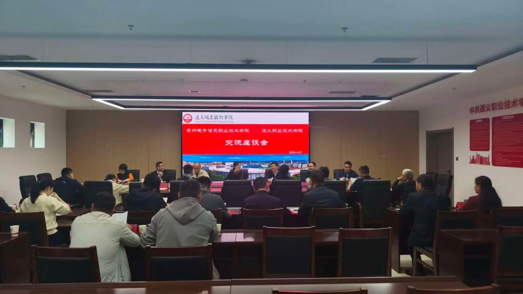 4月27日,贵州电子信息职业技术学院党委书记鲁轶与党委副书记、院长郑海东一行来我校交流座谈。党委书记颜永强及在家领导班子成员参加会议。会议由党委副书记、院长覃晓龙主持。