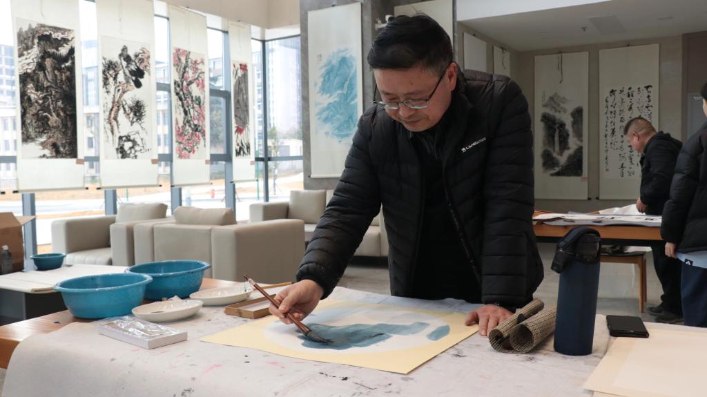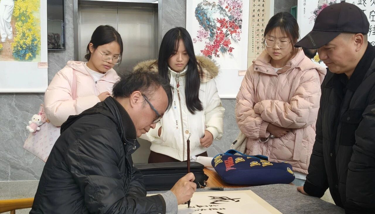 开幕式结束后,与会领导、嘉宾和师生共同移步展厅观展。现场翰墨飘香、丹青溢彩,氛围融洽祥和,仿佛置身书画艺术之境。多位书画家即席铺纸挥毫、进行创作,让传统书画艺术真切走进校园、浸润师生,为校园美育提供了生动实践平台。