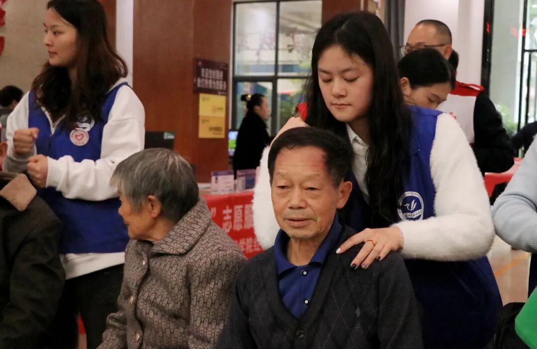 在按摩服务区内,志愿者们运用专业手法,为老人们进行肩颈、腰背按摩,缓解他们的关节酸痛,让老人们脸上露出了舒心的笑容。