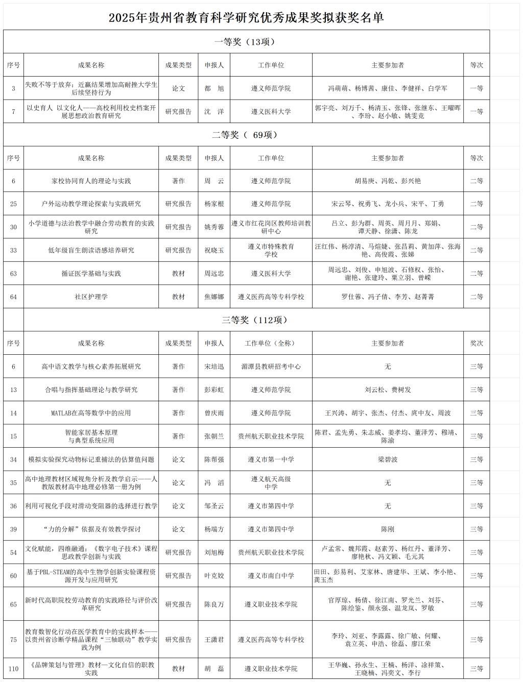 根据《省教育厅关于组织2025年贵州省教育科学研究优秀成果评选奖励活动的通知》,我厅组织开展了2025年贵州省教育科学研究优秀成果奖的评审工作。
