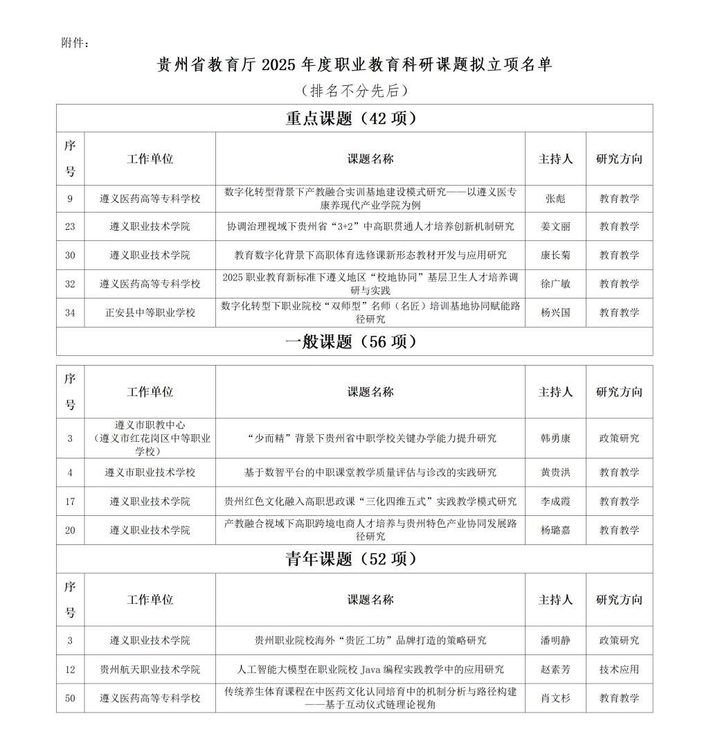 根据《省教育厅办公室关于组织开展2025年度职业教育科研课题申报的通知》要求,我厅组织开展了2025年度职业教育科研课题立项评审,经网络评审和现场评审,拟推荐立项课题150项,其中重点课题42项、一般课题56项、青年课题52项,现将立项名单予以公示。