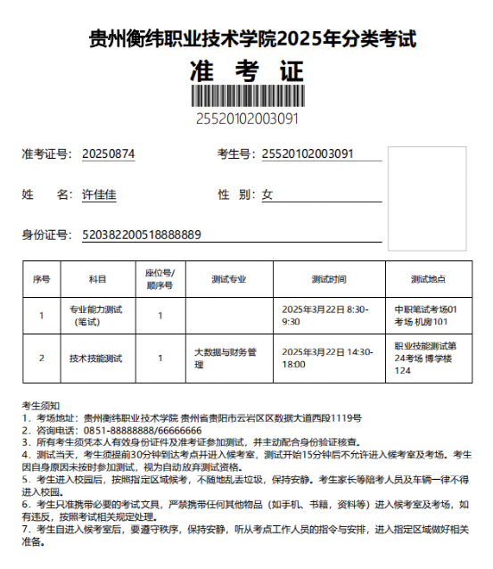 2.打印准考证后请考生务必认真查看准考证信息是否完整,注意测试科目、测试时间、测试地点等重要信息,若存在信息缺失等异常情况请稍后再次打印或联系招生就业处(0851-28655578)。