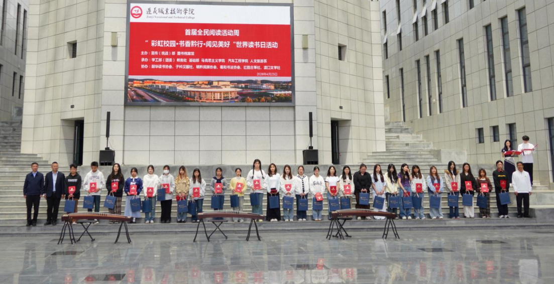 为深入贯彻《全民阅读促进条例》精神,传承中华优秀传统文化,纪念长征胜利90周年,营造"爱读书、读好书、善读书"的书香校园氛围,推进“马院+书院”协同育人工作,4月23日,由宣传部(统战部)、图书档案馆主办的首届全民阅读活动周暨“彩虹校园·书香黔行·阅见美好”世界读书日活动在新图书馆大楼广场举行。院领导颜永强、凃祥策、温龙岚、葛宁一、陈良万、刘婷及师生代表300余人参加活动。