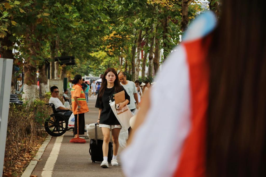 香樟树下光影浮动,行李箱滚轮声穿梭其间,宛如轻快的韵律叩响秋天的前奏。