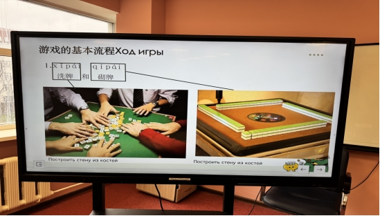 活动从麻将牌的基本构成入手,系统讲解了“万、条、筒”三种基础花色,通过生动的图示和实例演示,帮助俄罗斯学生快速掌握麻将的基本规则与获胜要领。