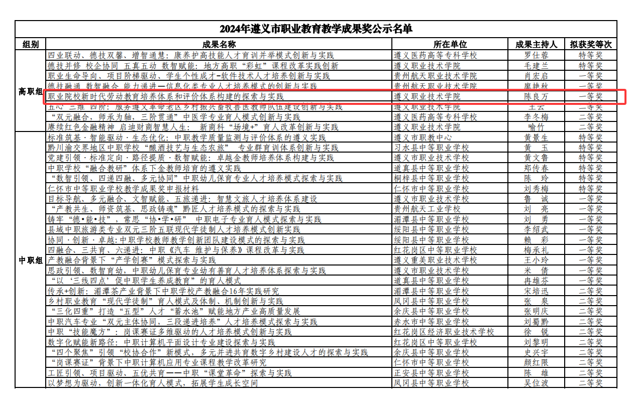 根据《省教育厅关于组织开展2024年贵州省职业教育教学成果奖申报评审工作的通知》《市教体局关于组织开展2024年遵义市职业教育教学成果奖申报评审工作的通知》等文件精神,开展了遵义市职业教育教学成果奖评选工作,共评选出特等奖8项、一等奖12项、二等奖13项。现将评审结果进行公示。我院获奖4项,特等奖1项,一等奖1项,二等奖2项。