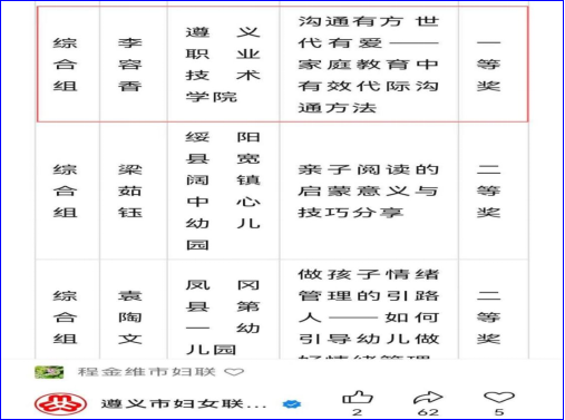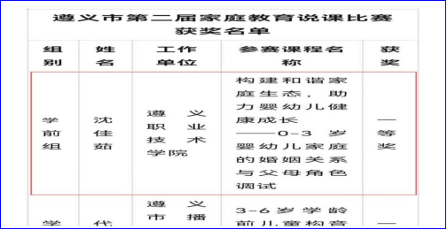 为提升全市家庭教育工作者的能力和水平,不断夯实家庭教育骨干教师队伍力量,2025年4月19日,市妇联、市教体局联合举办了遵义市第二届家庭教育说课比赛决赛,我院沈佳茹、李容香两位老师分别获学前组、综合组一等奖。