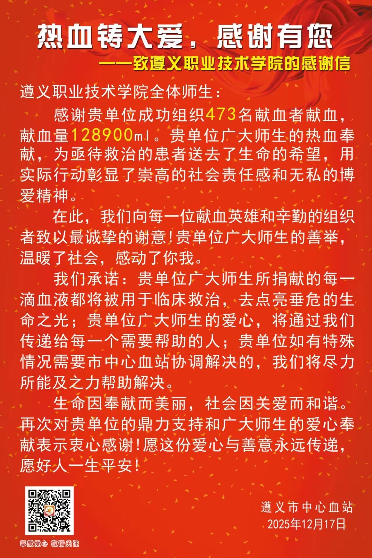 涓滴热血,汇聚生命暖流;拳拳初心,彰显青年担当。近日,我校收到市中心血站发来的感谢信,信中对我校在无偿献血工作中展现出的高度社会责任感和组织执行力给予高度肯定,对踊跃参与献血的师生们致以诚挚敬意。