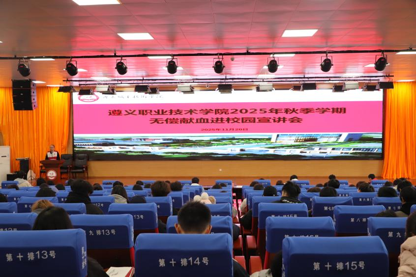 2025年11月20日,遵义职业技术学院2025年秋季学期无偿献血进校园宣讲会在娄山大讲堂举行。参加此次宣讲会的有全体辅导员(班主任),大一、大二在校班级团支部书记或者班长,各系(院)青年志愿者协会骨干。遵义市中心血站罗均老师为广大同学作了《无偿献血科普知识》的宣讲,消除了同学们对献血的疑虑和误区。此次宣讲会不仅是知识的普及,更是爱心的传递。